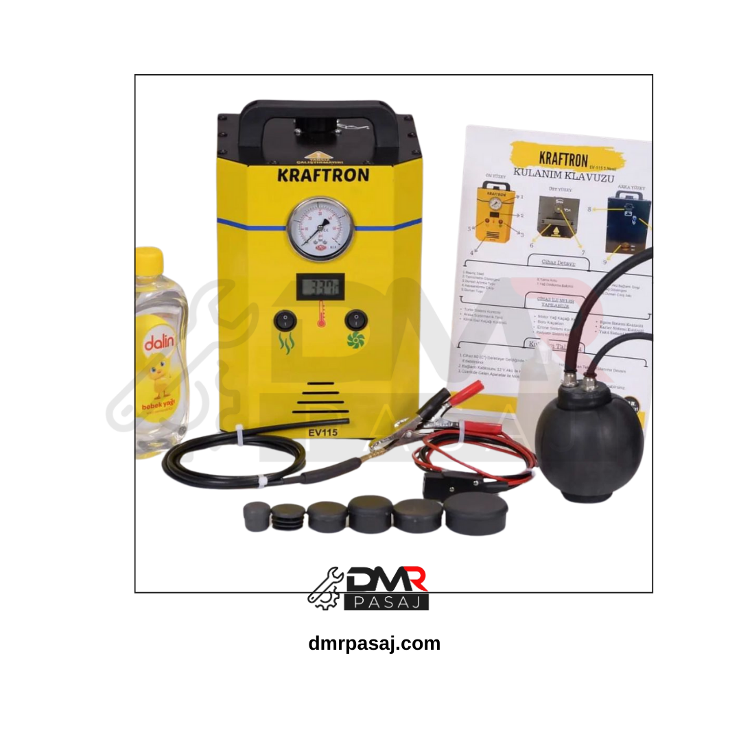 Kraftron Duman Kaçak Test Cihazı, araçlardaki motor vakum sistemleri, egzoz boruları, yakıt buhar geri dönüşüm sistemleri, turbo şarj hatları, klima sistemleri ve yağ manifold & intercooler sistemlerindeki kaçakları tespit etmek için tasarlanmış profesyonel bir cihazdır. Entegre hava pompası sayesinde ek bir cihaza ihtiyaç duymadan çalışır ve 12V elektrik bağlantısı ile 30 saniye içinde duman üretimine başlar. Düşük basınçlı ve zararsız duman üretimiyle aracın bileşenlerine zarar vermeden hassas kaçak tespiti sağlar.